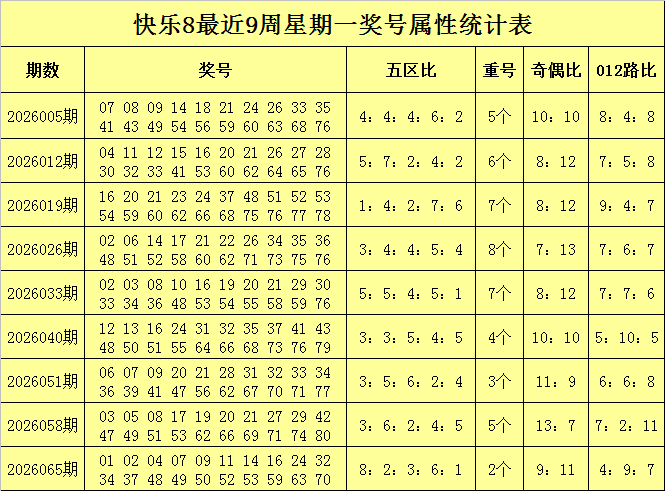 奇偶比分析:最近9周星期一奖号奇偶总比为84:96,偶数号码进展较热,最近3周星期一奖号奇偶比分裂开出11:9、13:7、9:11,本周星期一瞻望偶数走势活跃,参考奇偶比8:12。