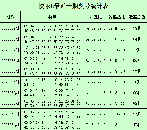福彩欢然8第2026071期开奖总结:02 03 08 12 13 14 15 21 25 29 42 44 45 46 47 48 52 58 63 66,其中奖号四区比为7:3:8:2,冷温热码比为1:8:11,遗漏总值为47。