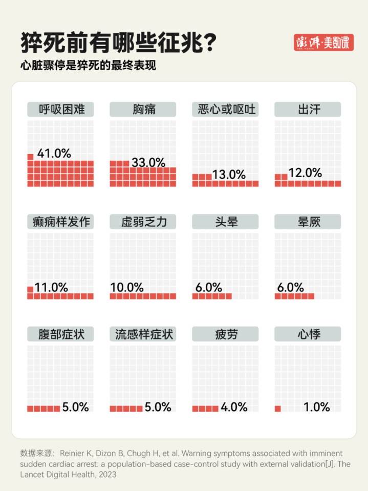 许多东谈主误认为暴毙“说来就来”,毫无预兆。但探究发现,有51%的患者,在发生暴毙前的四周内,其实依然出现过明确的预警症状,其中最典型的便是胸痛与呼吸可贵。