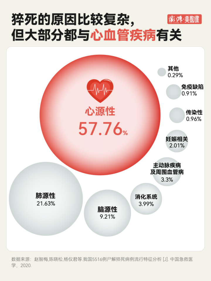 暴毙的诱因复杂各样,但绝大深广齐与心血管问题密切联系。数据泄露,心源性暴毙占比高达57.76%,远超肺源性、脑源性等其他原因。