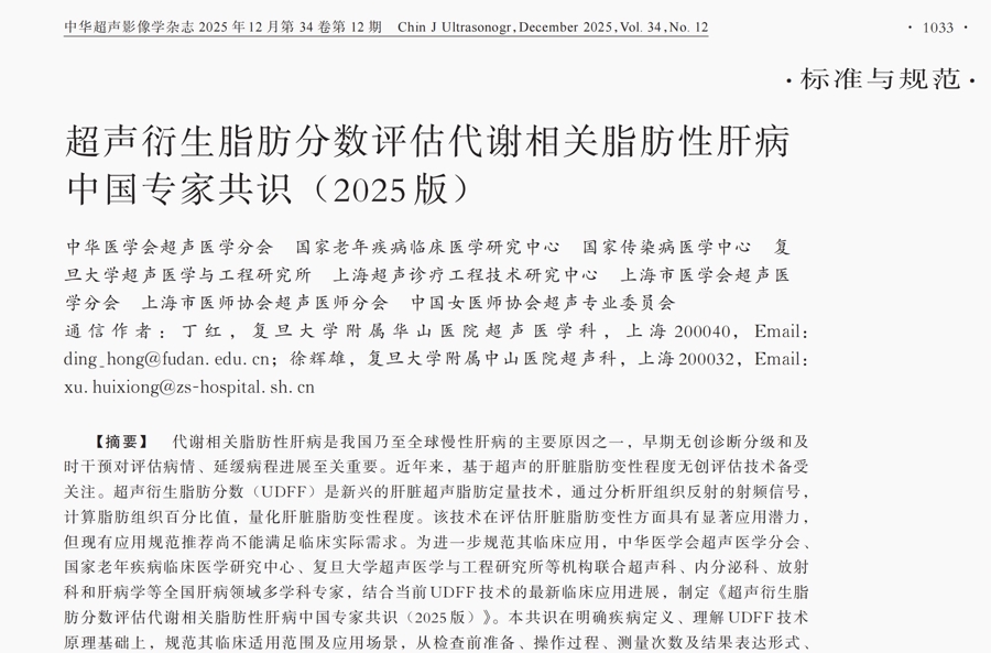 就在今天,《超声衍生脂肪分数评估代谢相关脂肪性肝病中国专家共识(2025版)》正式发布。《共识》由华山医院超声医学科丁红教授、中山医院徐辉雄教授共同牵头制定,是国际上首个系统性的超声新技术定量评估脂肪性肝病的实践指南,这也标志着脂肪肝超声检测从模糊的“定性描述”迈向精准的“定量测量”,为我国代谢相关脂肪性肝病精准防治体系的构建提供了重要支撑。