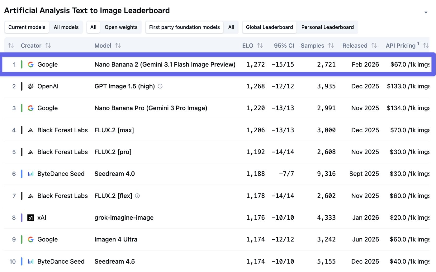 AI基准测试机构Artificial Analysis今天发文提到,Nano Banana 2以Nano Banana Pro的一半的价钱在文生图榜单中排名第一,在图像剪辑榜单中排名第三,仅次于GPT Image 1.5和Nano Banana Pro。